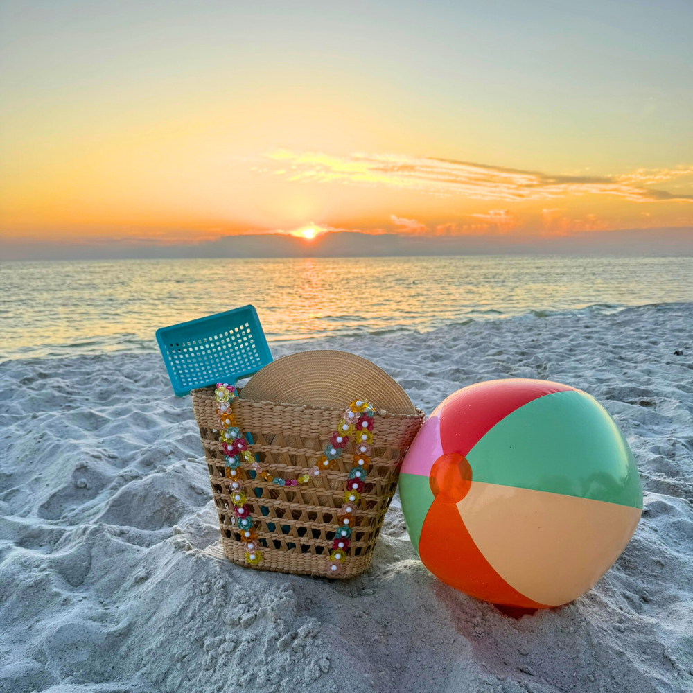 The cutest beaded beach tote has arrived. This woven natural straw beach tote is embellished with a unique multicolor beaded top handle. Interior basket is reinforced with sturdy boning so you can carry all of your beach & summertime essentials!