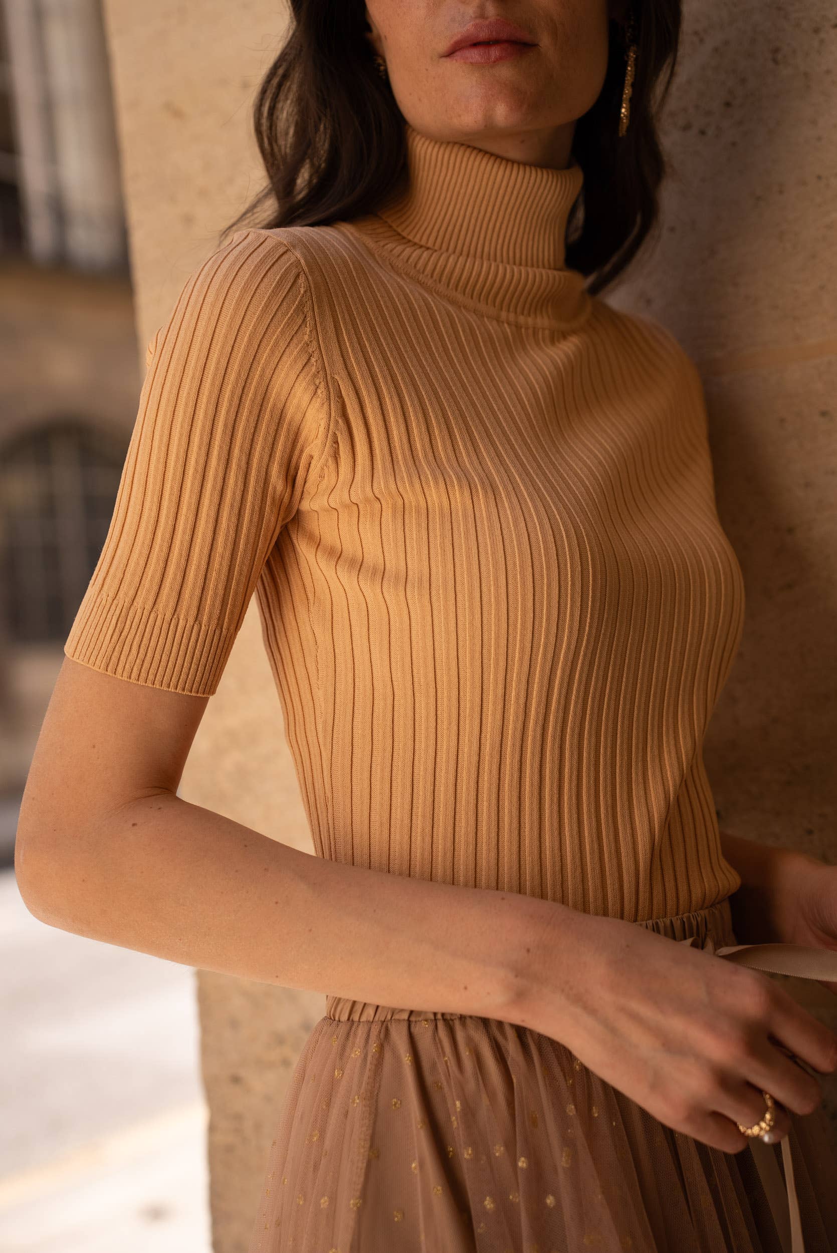 Ribbed knit turtleneck T-shirt, short sleeves.