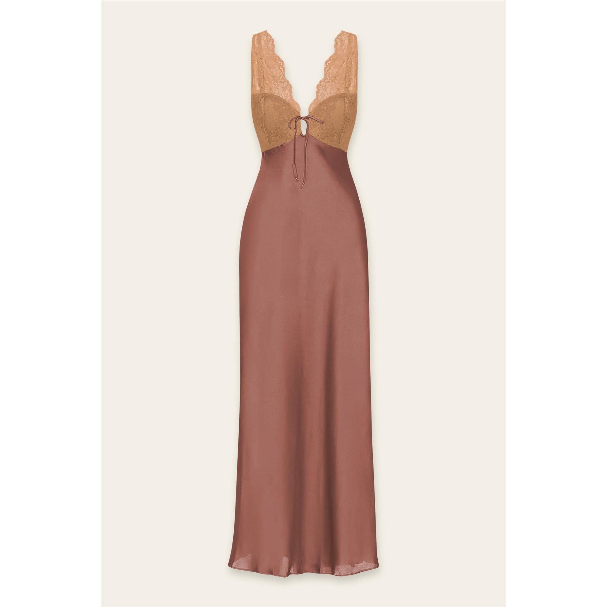 Lace and satin contrast lingerie-inspired maxi dress. - Pull on design - Plunging neckline - Tie closure with a keyhole on the front neckline