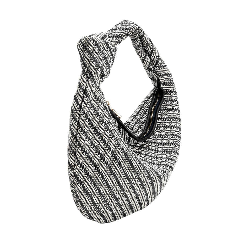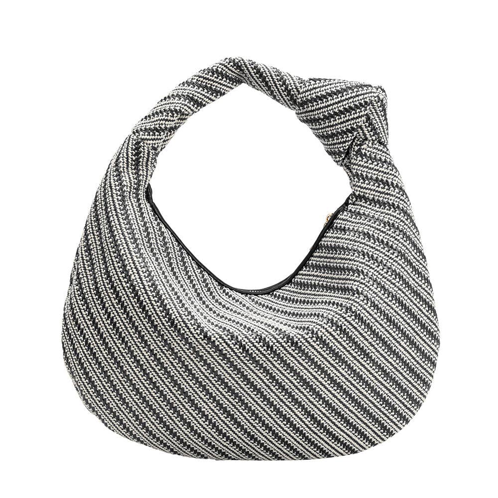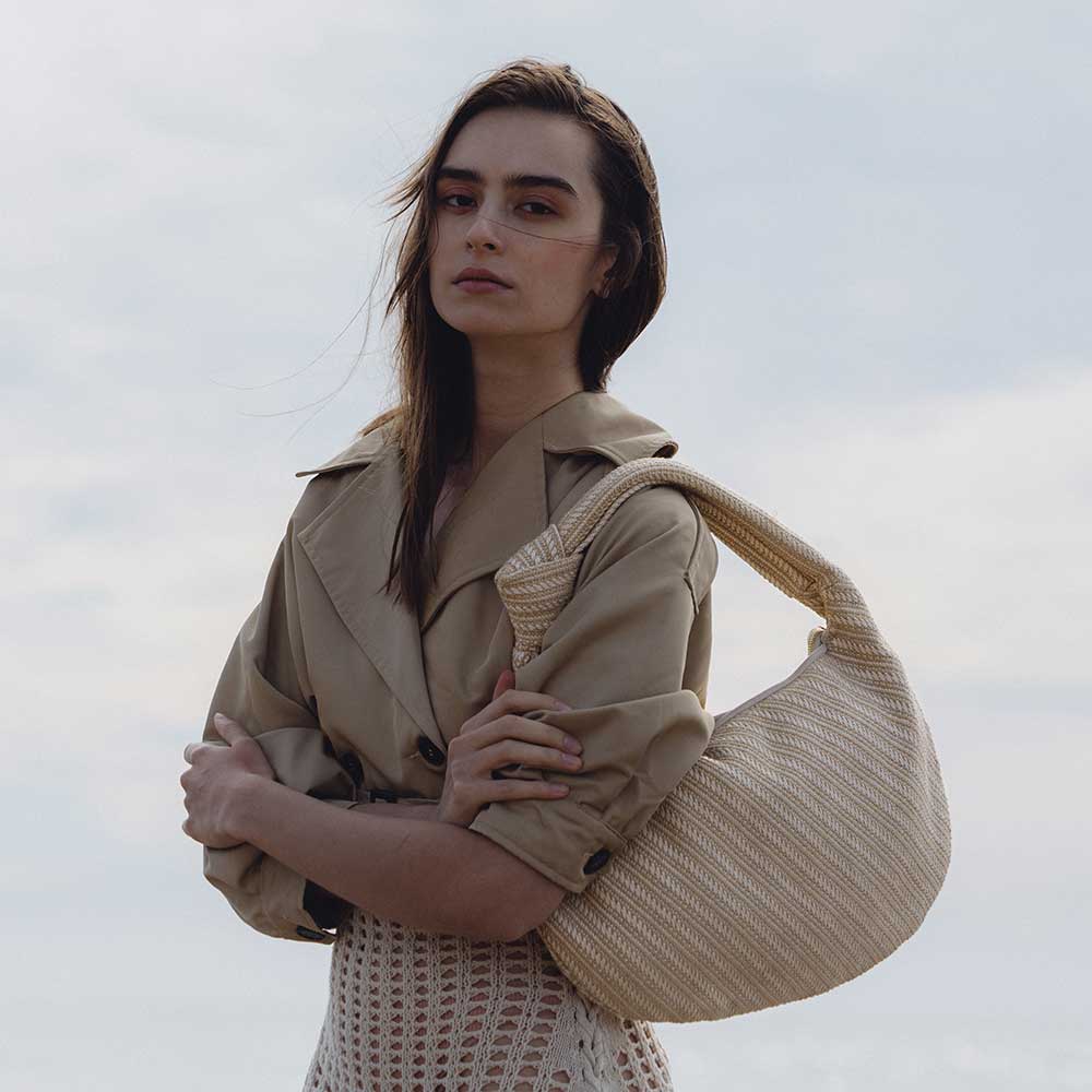 Our Cher shoulder bag will have you ready to enjoy warmer nights and brighter days. Trimmed with recycled vegan leather and made with lightweight raffia in a two-toned pattern. This large version can fit essentials plus a standard-size tablet. Features interior zip and slot pockets. Straw