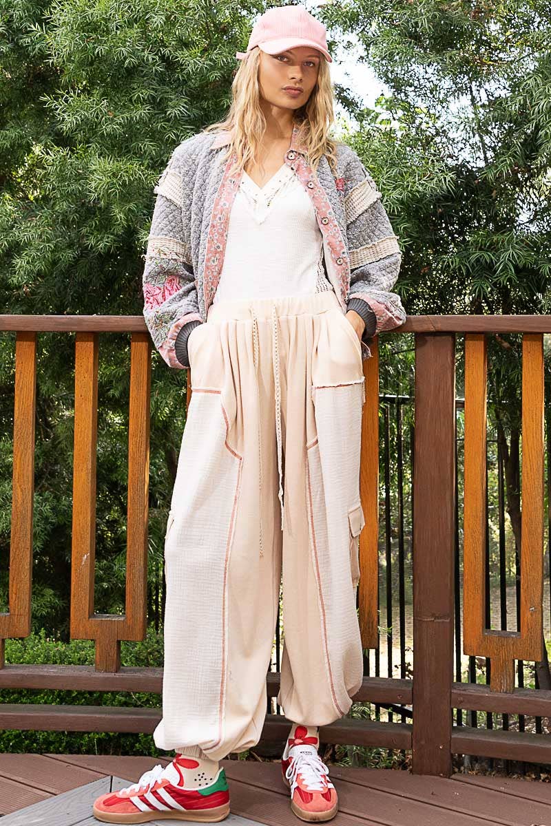 Designed in balloon sleeve regular fit jacket top in quilting with out seam, thermal and twill patch, embroidery, rib band, metal floral button, front pockets, vintage washing.