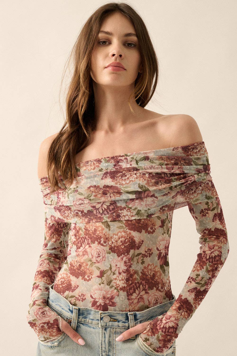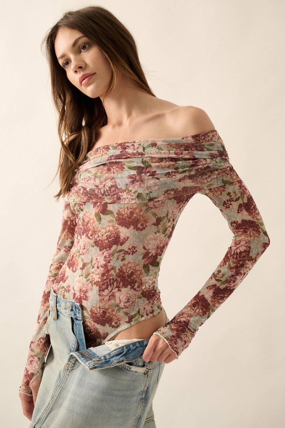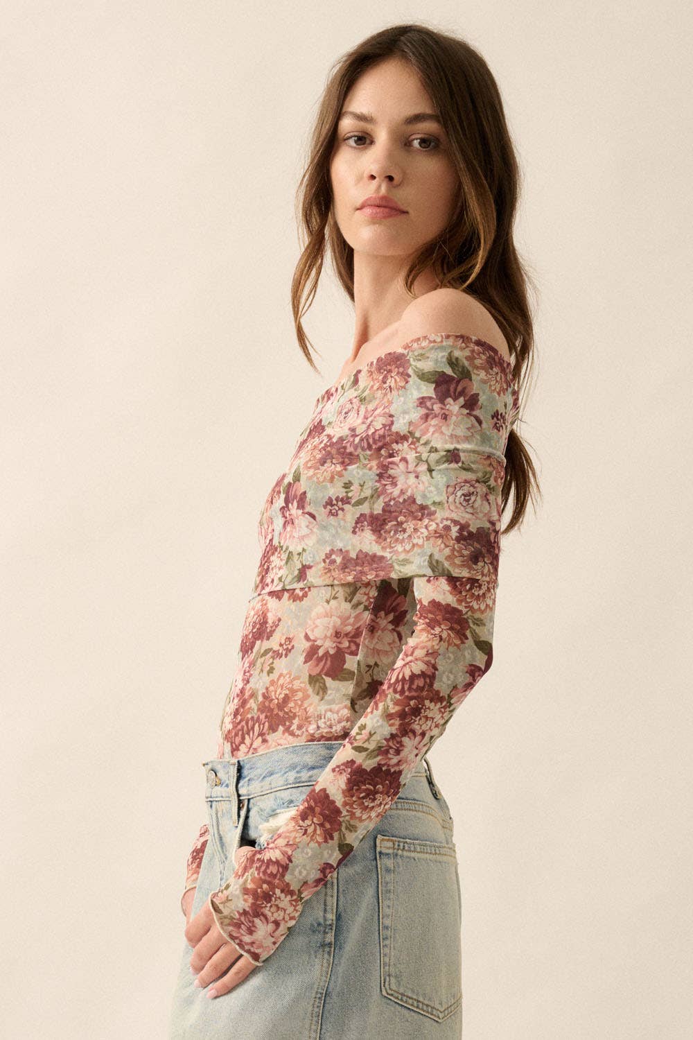 Promesa USA - Floral Mesh Off-Shoulder Knit Bodysuit