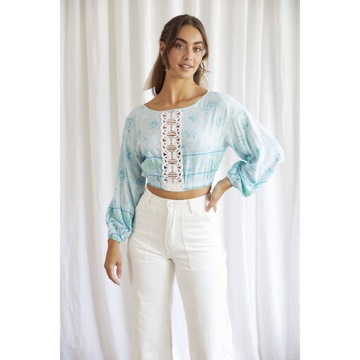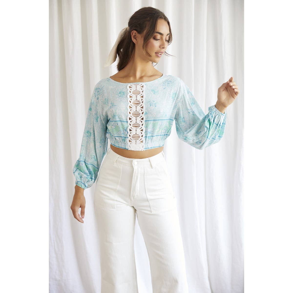 Rayon floral print balloon sleeved crop top with elastic waist band and crochet insertion at center front, tied keyhole back