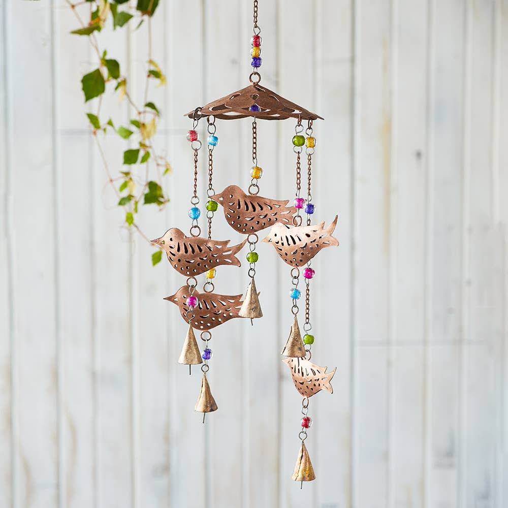 Shimmery carousel chime features some favorite high flyers. Each strand is dotted with colorful glass beads and finished with a small iron bell that produces a soft, bright jingle. Recycled iron with hand-painted finish.