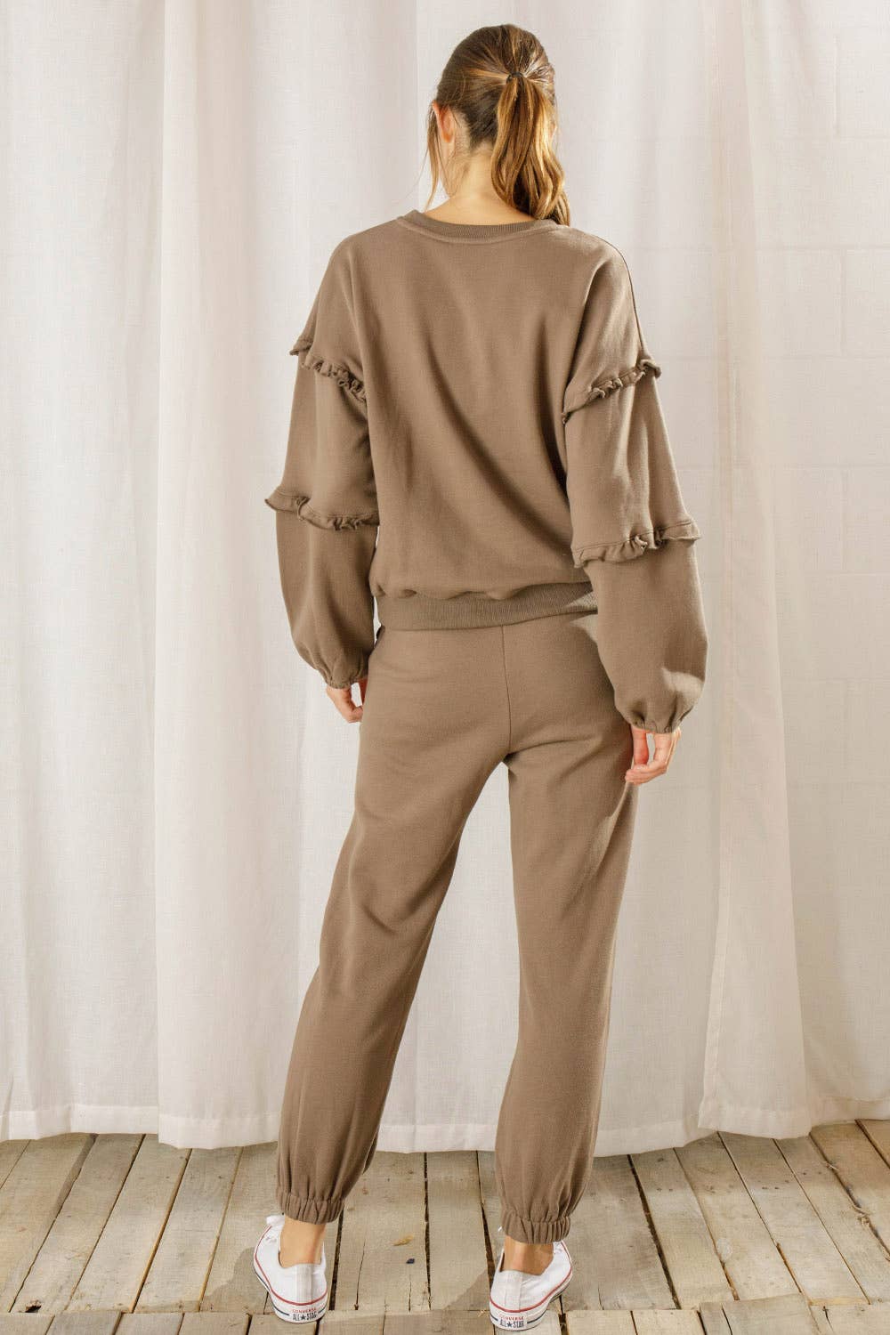 Solid colored ruffled pullover sweater. It displays a round neckline and a loose, oversized body. It also has long sleeves with ruffles around the sleeves, and gathered cuff ends.
