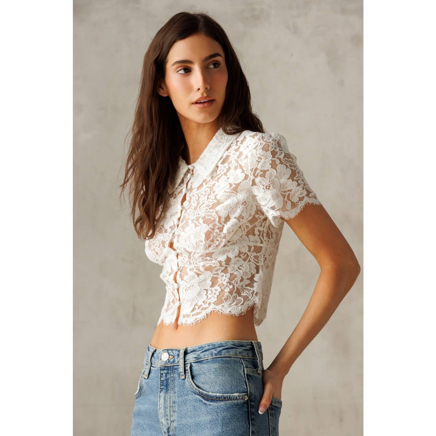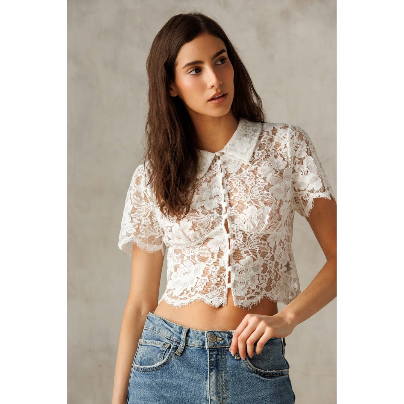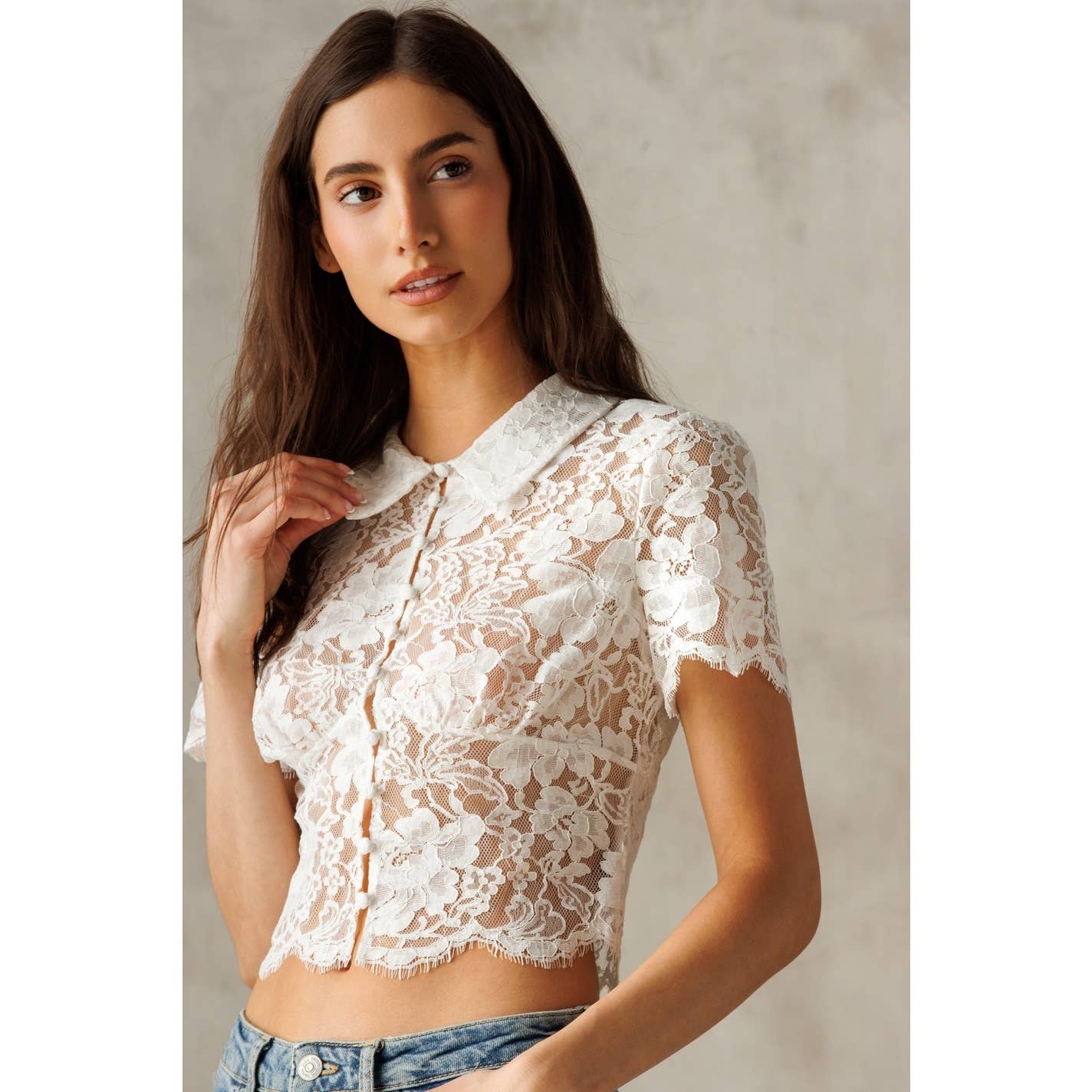 This ethereal lace crop top is a delicate blend of elegance and boldness. Crafted from intricate floral lace, it features a classic collared neckline and button-down front for a timeless touch. The short sleeves and scalloped hem add a romantic flair, while the sheer fabric invites layering creativity.