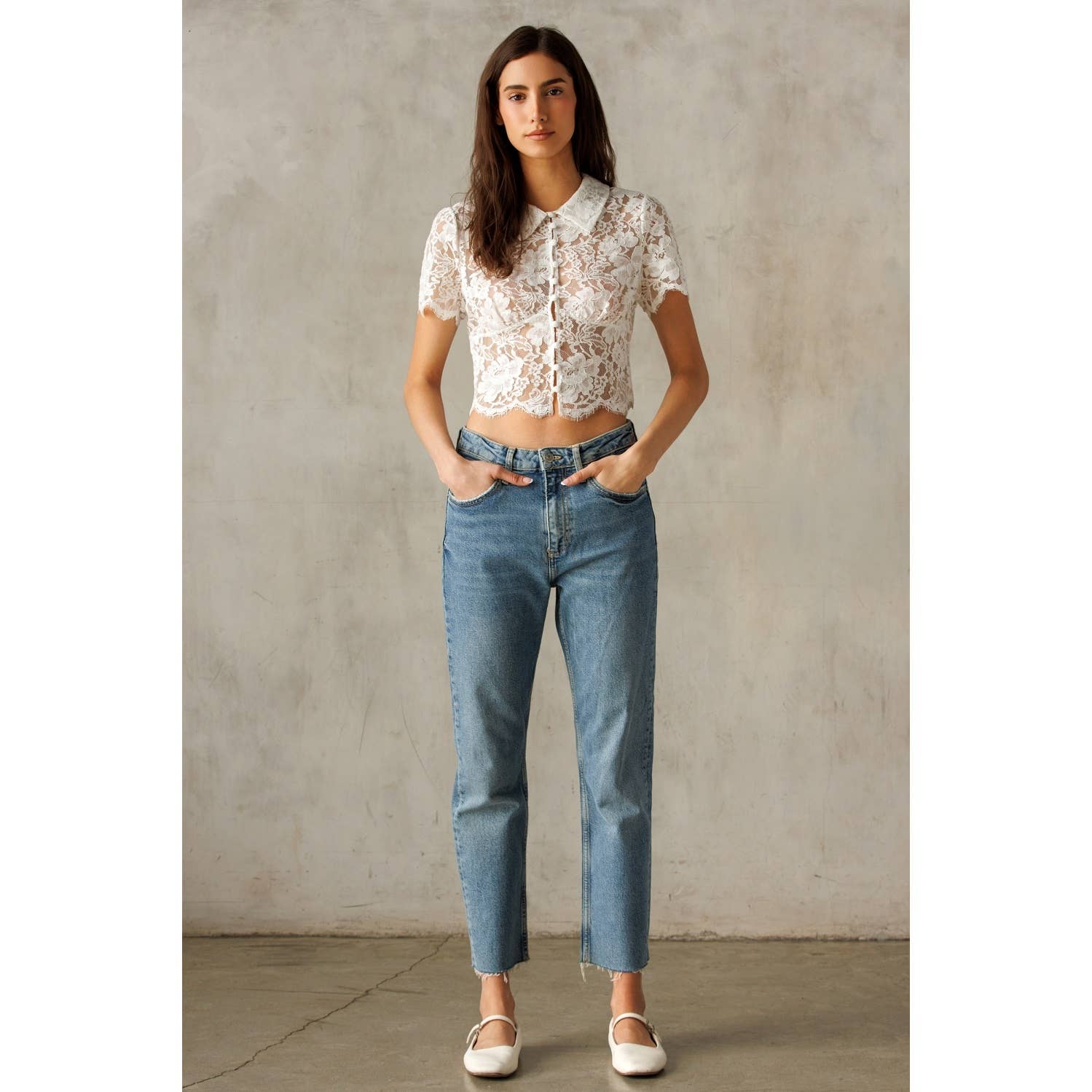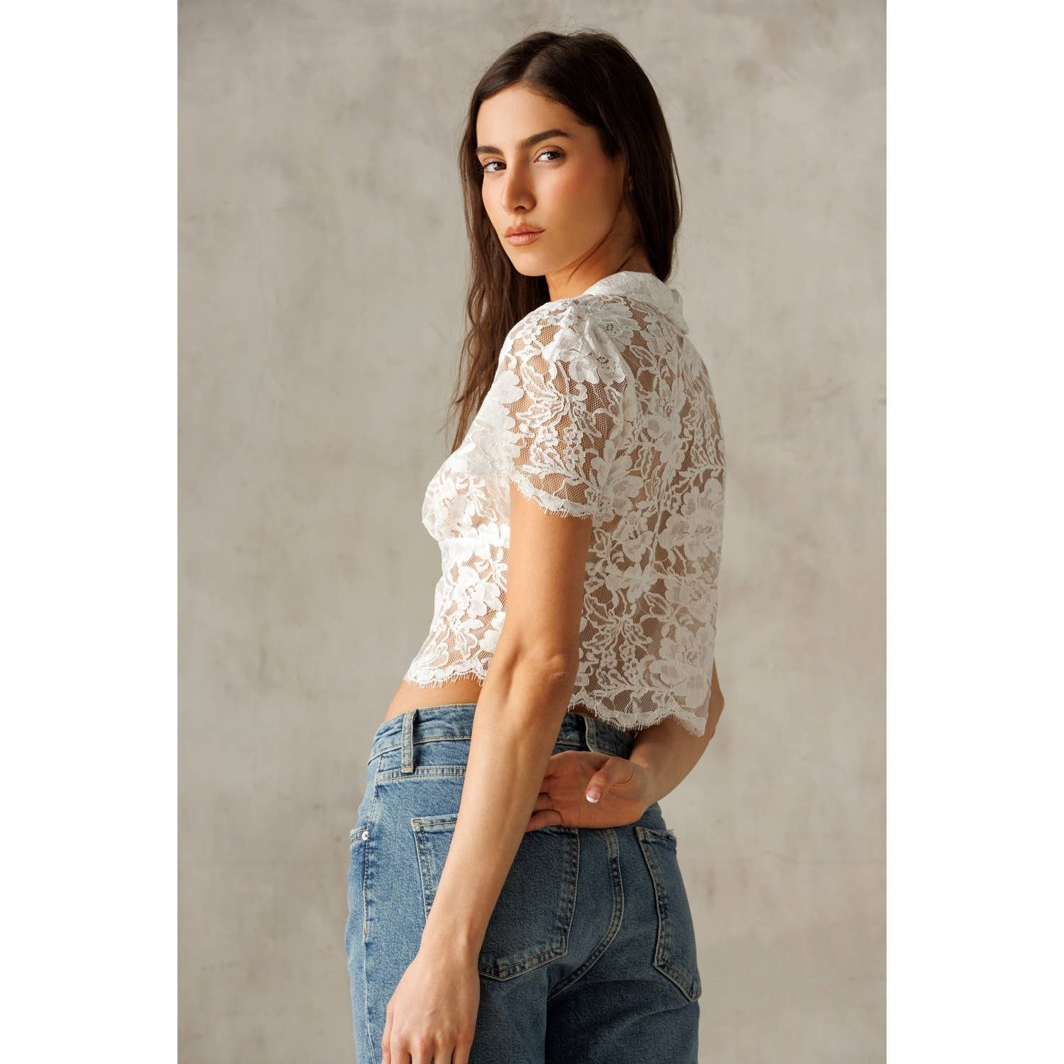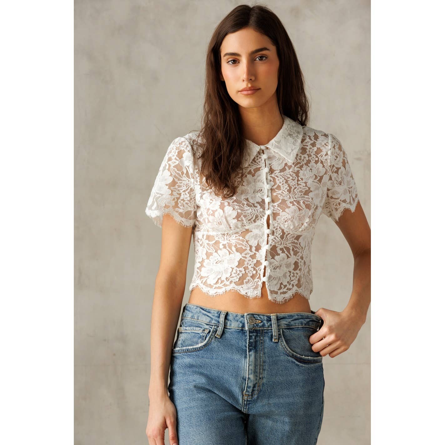 This ethereal lace crop top is a delicate blend of elegance and boldness. Crafted from intricate floral lace, it features a classic collared neckline and button-down front for a timeless touch. The short sleeves and scalloped hem add a romantic flair, while the sheer fabric invites layering creativity.